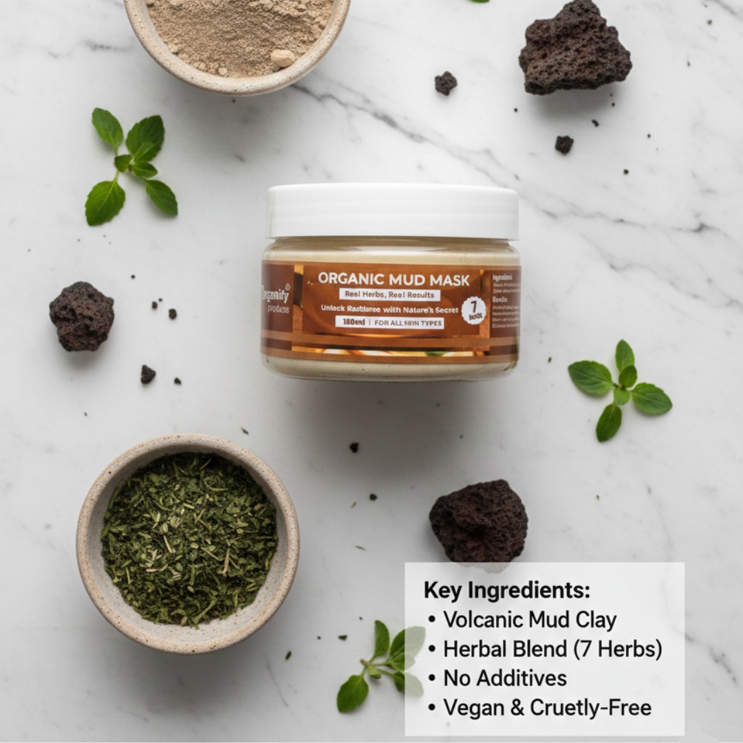 Experience deep detoxification with MJ Organify Multani Mitti 7 Herbs Clay Mask, a premium blend of pure Fuller’s Earth and seven powerful herbs traditionally known for their skin-purifying properties.